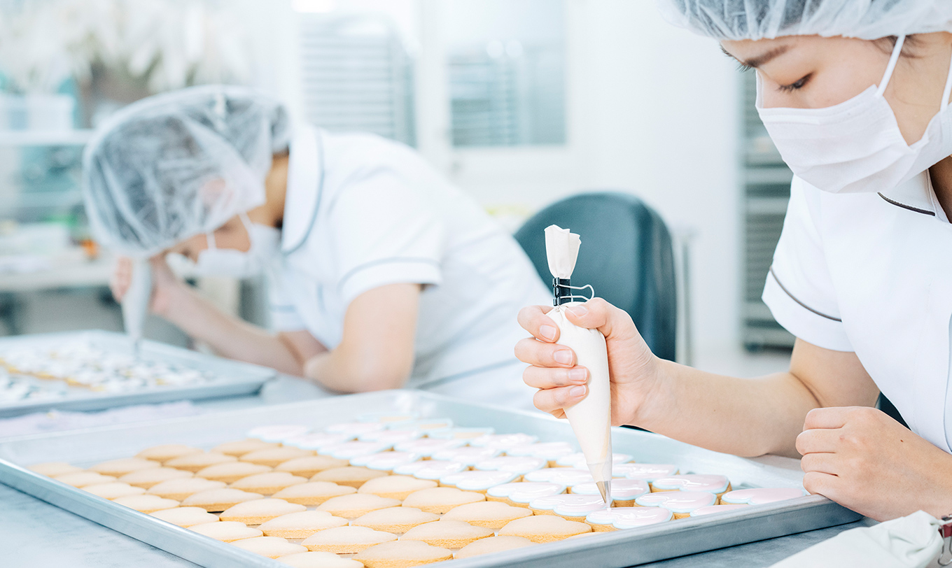 第三機関による各種検査、金属探知機、従業員の健康診断といった万全の管理体制を整え、熟練の技術スタッフがひとつひとつ手書きする丁寧な手仕事で安全・品質・衛生管理をおこなっています。